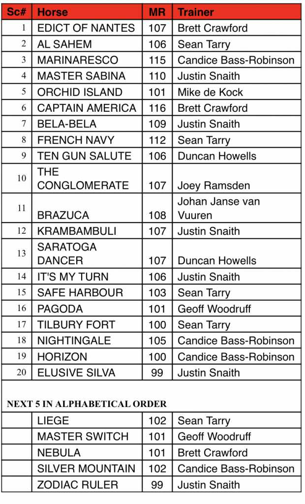New to the Log is the Betting World 1900 winner from the Duncan Howells stable, Ten Gun Salute, who has been allocated the ninth spot while Safe Harbour from the Tarry stable leapt out of the “looking on” section into 15th place. After his improved run to finish third in the Daily News 2000, the Bass-Robinson-trained Horizon became a new member of the top 20 to take 19th place and another Tarry runner, Tilbury Fort, made his first appearance on the log in 17th position.