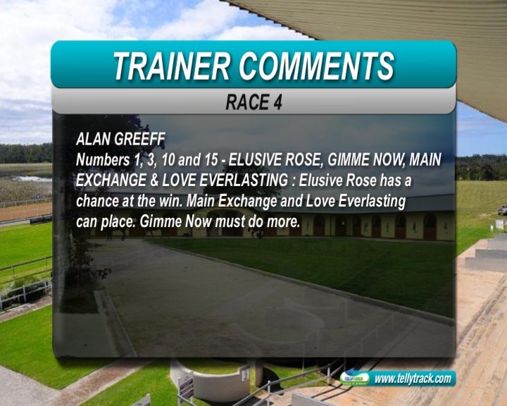Race 4: Love Everlasting(15) 11-1 This horse I like a bit and is 3.5kg better off with the favourite Morethanthat(6) 33-10 for a 3.75 length beating after being slow away 3L, and on top of that is better drawn than that particular run. Elusive Rose(1) 3-1 came out and one after that run where she was 6th 7,0 behind 3,25L behind Love Everlasting. Gimme Now(3) 25-1 & Van Dam’s Force(13) 10-1 are the others I like for outsiders in a VERY OPEN RACE.