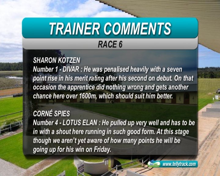 Race 7: Varonella(9) 8-1 ran an approved run behind Vasity Cup(4) 28-10 (2.9 lengths) and is 7kg better off with the appie claiming. This appie has been winning at this centre lately and I expect him to guide this horse home with a postage stamp. Kingoftheworld(1) 14-1 should run well with Stable companion Favour’s Pride(2) 5-1 which won on Friday and will carry extra weight than carded. Keep an eye out for Vous Et Var(3) 10-1 which finished 5.30 lengths behind on debut at this course but on the grass. Has run on poly before in Natal so improvement expected and we know how Ndlovu has been winning for the GREEF stable. Sweetchild O Mine(6) 6-1 has been given an 8 pound penalty for last win so will be outclassed. ANOTHER OPEN RACE