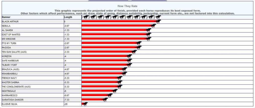 Best draw; Champion Jockey; ran a huge trial in Daily News, when caught wide for 600m from a bad draw and now has a 1lb (²⁄₃ length) pull in the weights with Edict Of Nantes. From 6 lifetime starts, 3 wins, 2 seconds. As a 3YO meets 4YO BLACK ARTHUR on 5lb worse terms than WFA. A very hard horse to beat.
