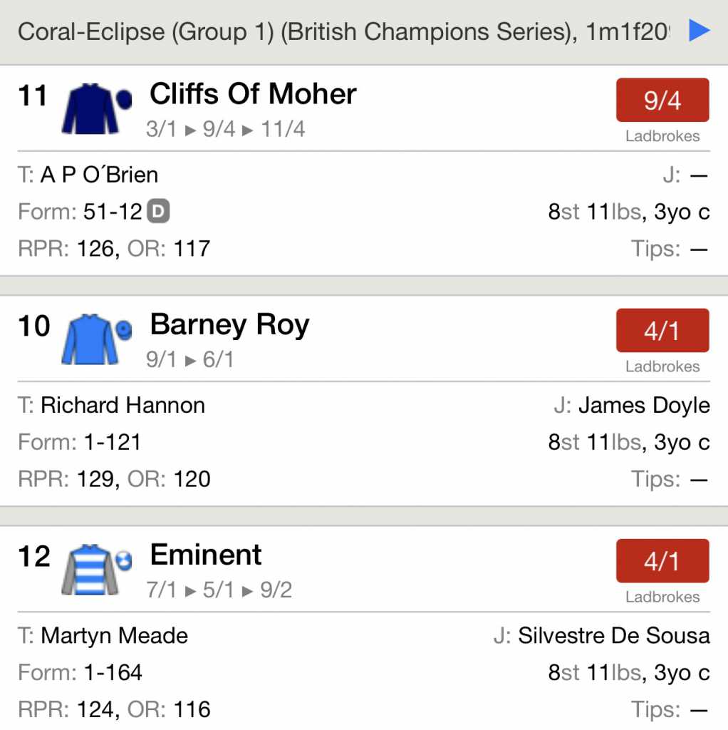 As much a Barney Roy fan as I am, I'm doubtful if he'll stay...if he does then he'll go close. but I'm going to be on Cliffs of Moher - should drift close to race time as Barney shortens. The derby 2nd should prefer this trip. Just got outstayed in the Derby and looks ready to progress from there.