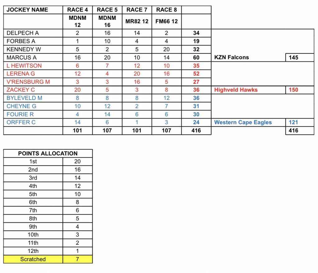 Some consolation for the Falcons was that Anton Marcus finished Victor Ludorum, eight points clear of second-placed Hawks rider Gavin Lerena who had a lucrative afternoon, booting home a double.