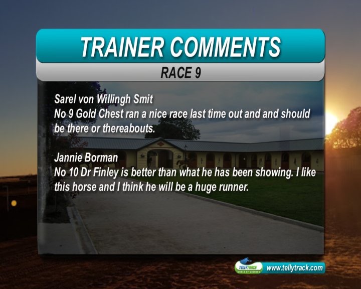 Race 9 (3) Teagens Boy. He is better than his form suggests. He is drawn 14, but does not like the kick-back, so it will suite his style of running. Comes of a rest so will be fresh.