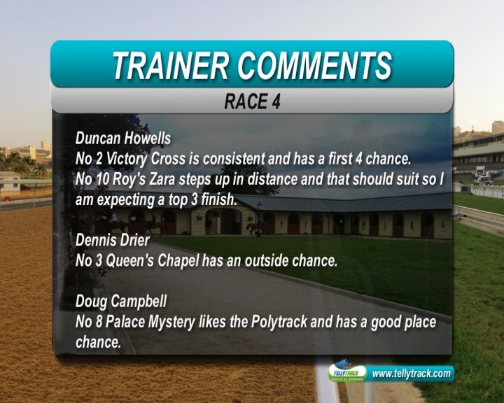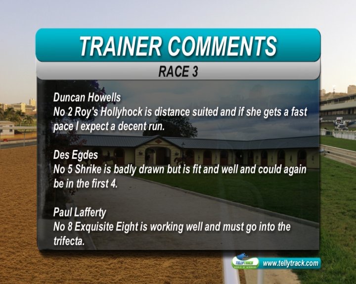 Race 3: Roy’s Hollyhock(2) 2-1 will be running on from behind and expect an improved run from Yess(12) 7-1 who should also enjoy the extra but is drawn wide. Pomona(1) 28-10 has been expensive to follow but this is a weak field after the scratching of the favourite.