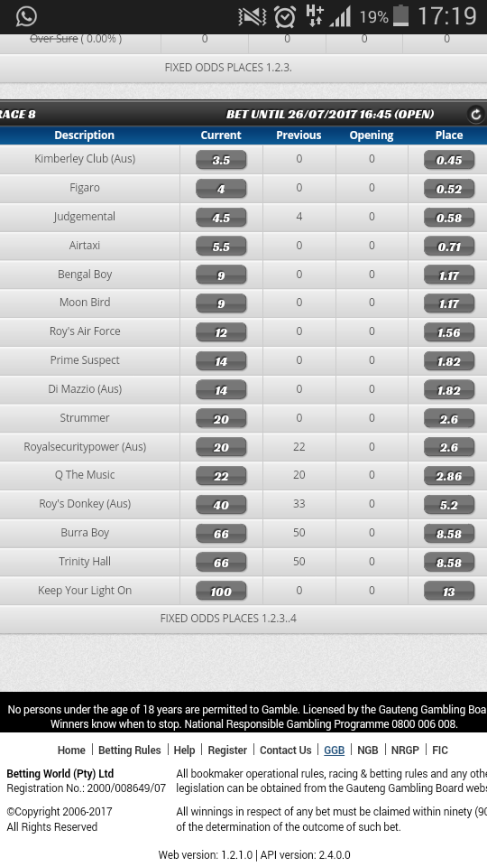 8 years 9 months agodurbs wrote:Backed into 14-1 now and 21-10 first four.You sure you could get 13-1 top four this morning?Brendanr wrote: Keep your Light on in the last achieved an 85 in his last outing this C and D in an allowance plate where he stayed on well in a strong field. Of a 67 today he should be in the top4 if he confirms last run. Looks like the short rest, removal of blinkers and tongue tie seems to have benefitted. Not great that he's unplaced in 7 on turf and unplaced in 6 this C and D but he is a 2 timer winner over the 1200. Peak run and worth a bet imo. Was a huge 13/1 top 4 this am.