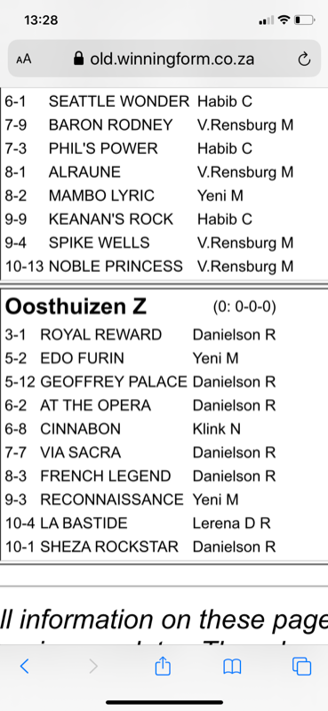 6 years 1 month agoZietsman Oosthuizen wrote: Thanx guys . Monday we getting going , no stablejock yet Elvis ... that blerrie Munger dont want to come back after his double on the weekend in Singapore