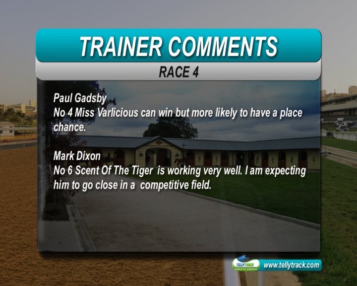 Race 4: HIGHWAY EXPLORER (AUS) b.g 6y 2011 looks the one to beat , with WALTZED HOME ch.g 6y 2010 in the shake up. much expected of SCENT OF THE TIGER b.g 4y 2013, should be right there along with MISS VARLICIOUS b.m 6y 2011