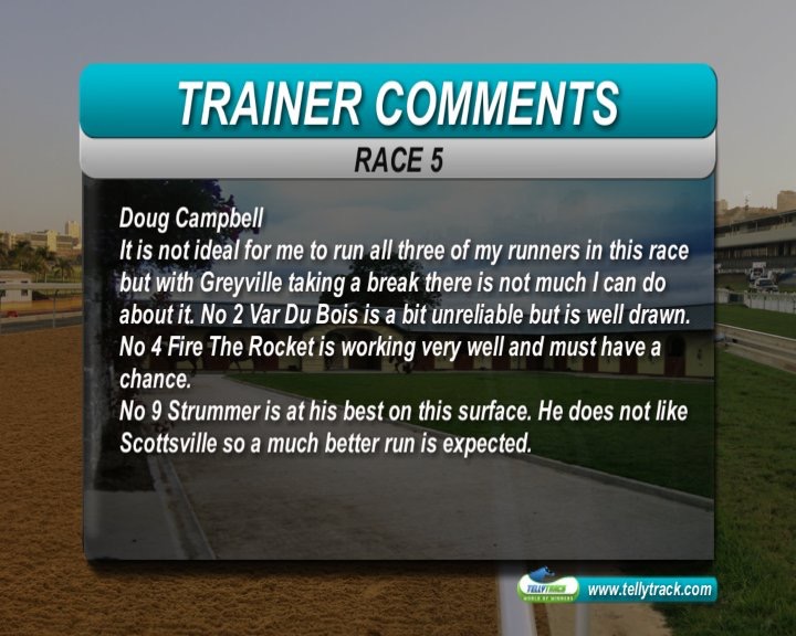 Race 5 : Hard to comment on HARD TO PLAY b.c 3y 2014 out of a race card, from turf to poly no guarantee's , that one and YANKEEDOODLEDANDY b.g 4y 2013 in my book have to beat FIRE THE ROCKET b.g 6y 2010 and ROY'S AMBASSADOR (AUS) br.g 6y 2010 should be in the shake up. For value I would be with FIRE THE ROCKET b.g 6y 2010 - unless there is no market support.