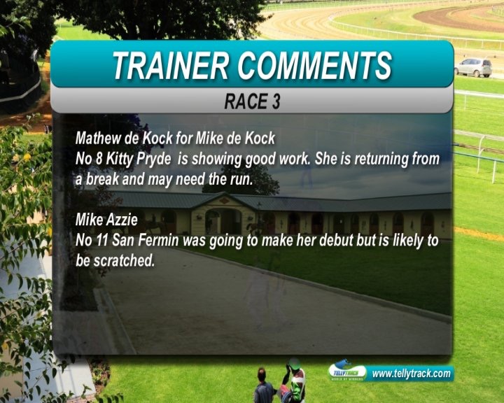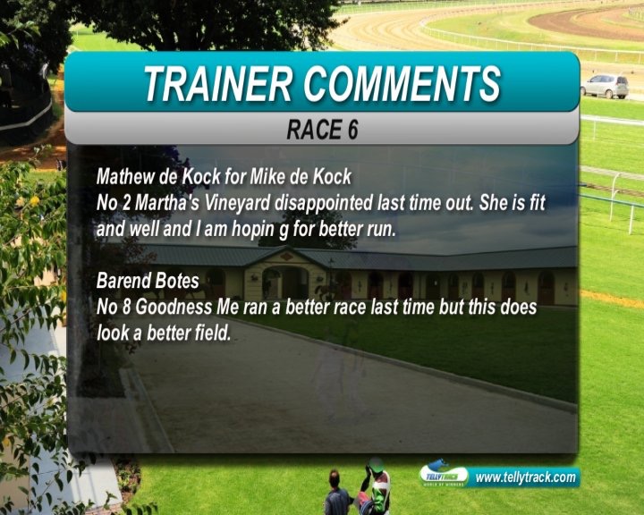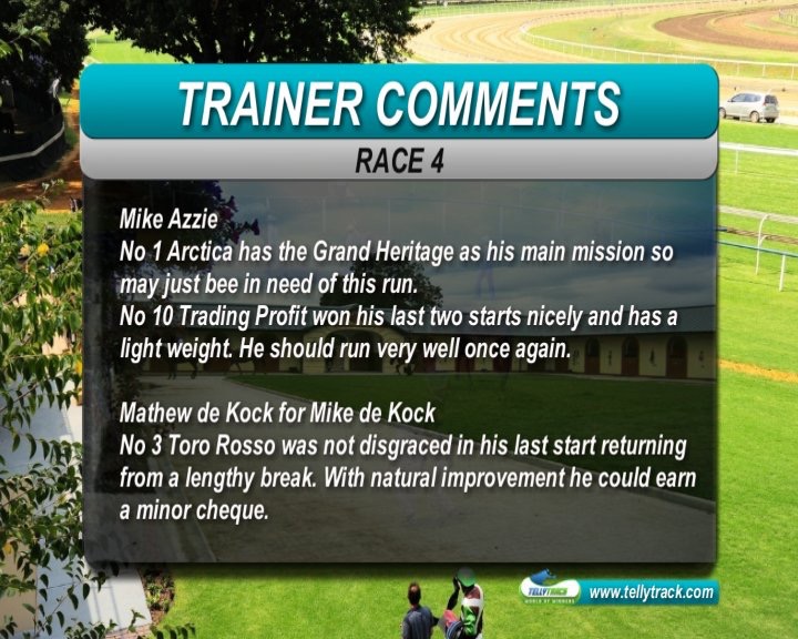 R1: Tammany Hall a stand out on form, but the de Kock debutante could make her run, many of her siblings have proven effective over 1400, so all things considered, TH should have the edge; Quinine and Hallucination to fight out 3rd on form - possible improver to include in the quartet is Orinoco Rock with Mosia up