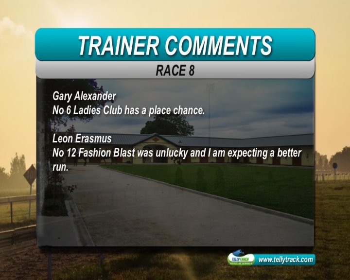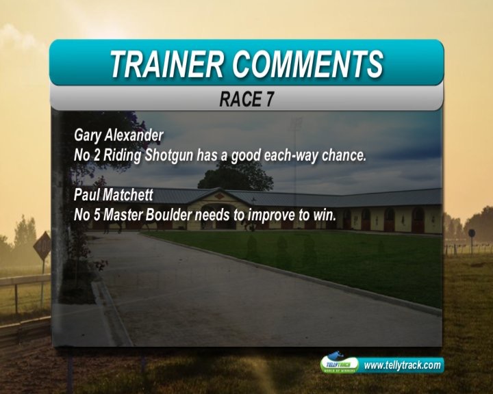 Race 7: Riding Shotgun has been given every chance placed in this very weak race - has to deal with Starcraft Prince and Master Boulder. Questions will be answered if he cannot beat these two , as he's currently riding high on having run 2nd to Broadway Trip - keeping in mind that he didn't make broadway trip work too hard at all - so the odds a bit skinny.