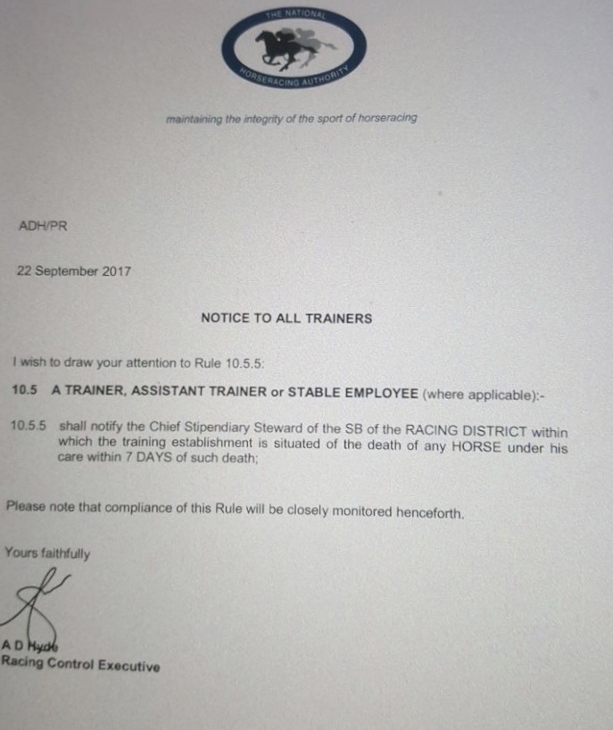 This rule is obviously not being adhered to by everybody. I assume that since the horse movement rule has been enforced, this side of things had improved. The death of a horse is an emotional time and after this occurs, the Trainer wants to put it behind him or many may be under the impression that it's not a horse movement as such, so do not notify NHA.