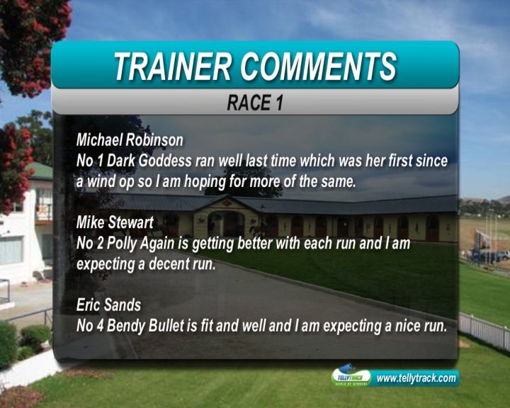 Race 1. Dark Goddess ran a fair race last time- her first after a wind operation. Was scratched a couple of weeks ago- cast in box, and bumped her leg. Was back in work after a couple of days so expect her to run a decent race from a nice draw and has an ew chance. Quite a competitive field. Bendy Bullet has solid form and a good draw; Ostinato would be first pick if not for her wide draw. Evie's Light another that should contest the finish. London Spirit good debut, and although not the best of draws should show significant improvement with the run under her belt. Polly Again and Goa include back end of quartets.