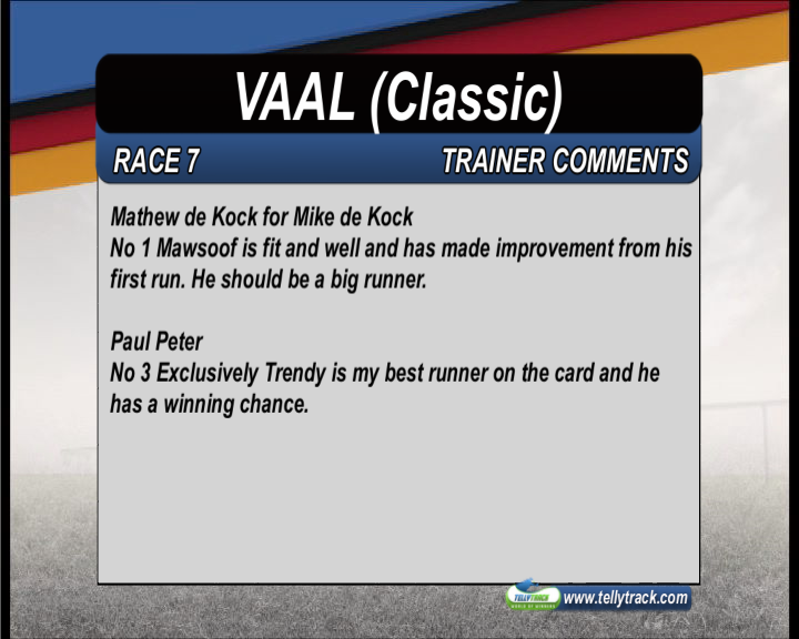 R7: Very interesting handicap; Mawsoof won as he liked on debut, but Ragnarok failed to frank that form on Tuesday evening and definitely not the stable's best 3 yr old; still looks slightly better than a 76, so obvious chance; stable confident about Exclusive Trendy, looks to be coming right and with Delpech riding is going to give Mawsoof something to think about imo; all the others trading in double figures and they are probably running for 3rd; the consistent Chief Sioux probably the most likely of the rest and imo should turn the tables on Daspoort, who improved a lot on soft ground last time, but today is definitely not going to be soft; down at the bottom of the weights Salute the Sun and Led Zeppelin can easily run into the money; Airtaxi unfortunately has been disappointing and needs to put his mind on racing - I think he may need blinkers and some more relief from the handicapper - still we live in hope and 1000 is probably his best trip
