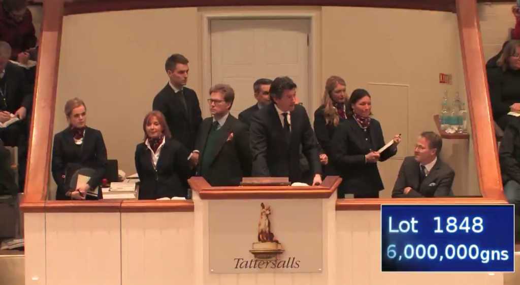 The highest priced horse ever sold at a European auction. Dual Gr.1 winner Marsha sells for 6,000,000gns to MV Magnier and receives a rapturous applause.