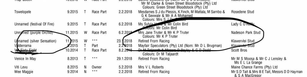 .....but for who(m) though.....not the banks....they are paying out more in training fees that what he is recouping.....Mayfair could never be profitable....so is he now trying to save Klawervlei and the CTS.....sure looks like it....this latest Mayfair registration is a Klawervlei deal that fell through at a CTS sale...... :whistle: