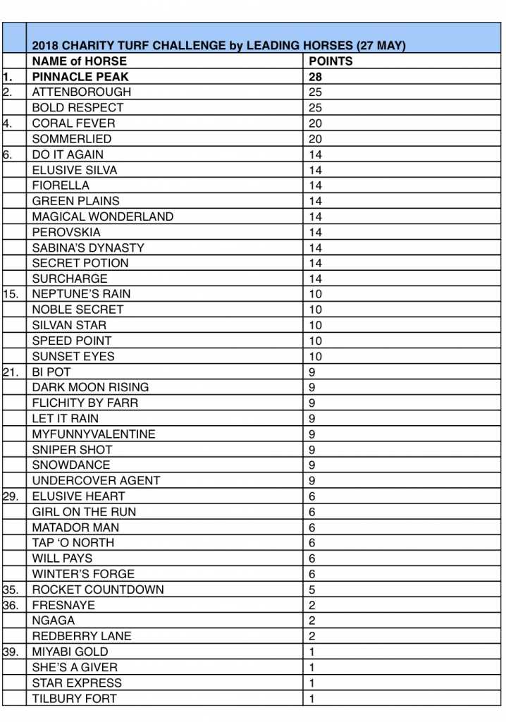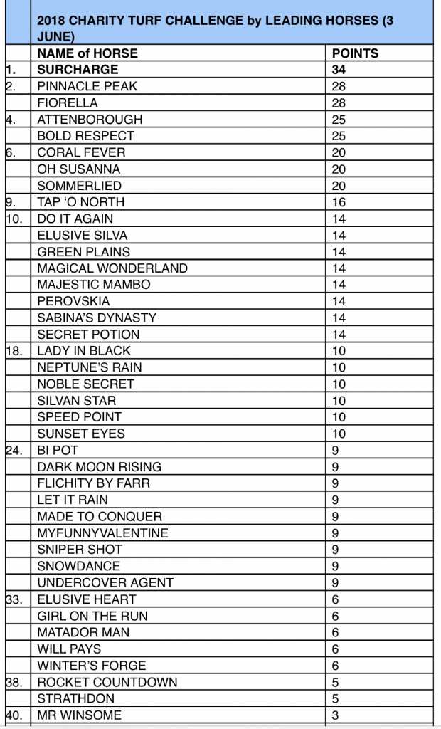 The tough Joburg racer, Surcharge, built on his Gr.1 SA Derby runner up position when coming with a well-timed run to lift the Gr.1 Daily News 2000 in good fashion. The 20 points earned puts him on top of the leader board with 34 points. The highly talented, but quirky Majestic Mambo gave his many supporters a thrill when storming home on the wide outside and staked his claim for a Vodacom Durban July run. Tap ‘O Noth ran well in third place, earning a valuable 10 points.