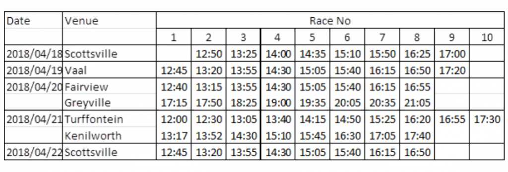 NB: Races 2 to 9 from Sun, 15-Apr will be run at SCOT Wed, 18-Apr, (alternatively at GREY POLY), times 12:50 to 17:00. Track inspection will be done on Tue, 17-Apr at 14:00.