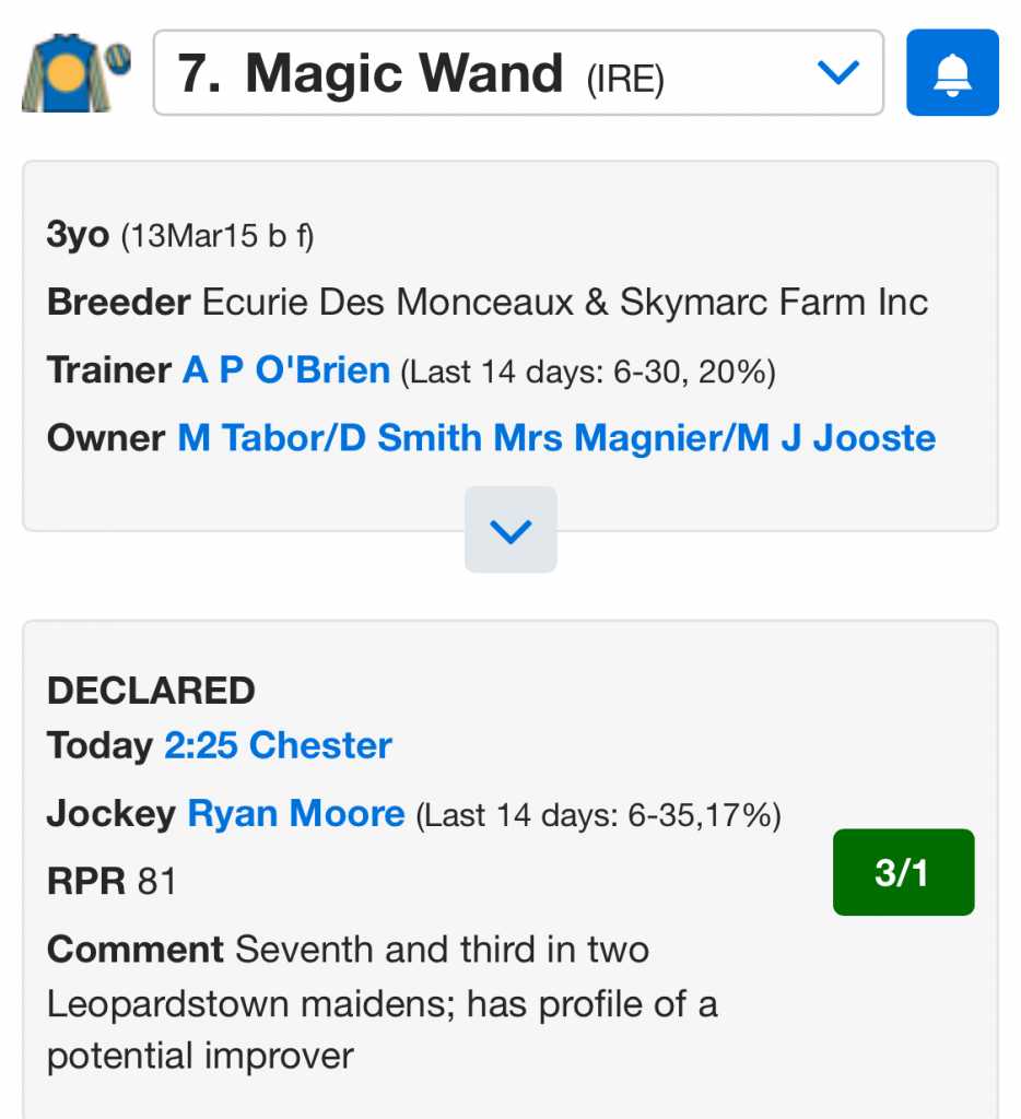 Chester Cup three day meeting is one of the best of the year especially if the sun is out. Low draws for races up to 7 furlongs have the advantage so No Lippy and Magic Wand for the first two races today, the double is just over 11/1