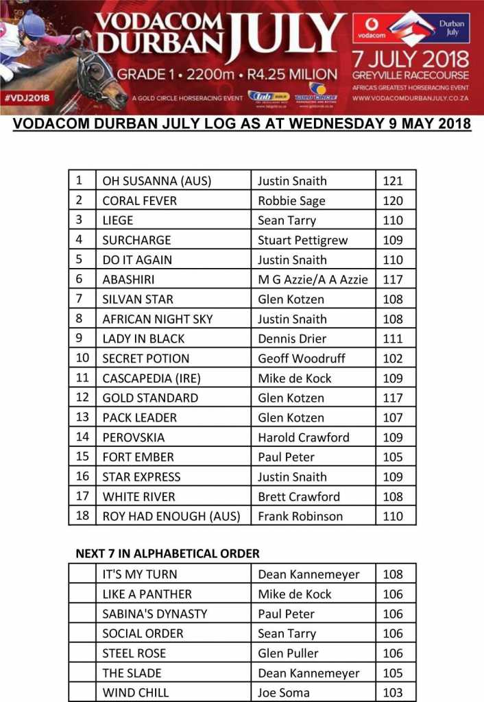 Star Cape filly Oh Susanna, impressive winner of the region’s premier event, the Grade 1 Sun Met, tops the first Vodacom Durban July Log released yesterday and heads an exciting and very strong top end to Africa’s greatest racing event.