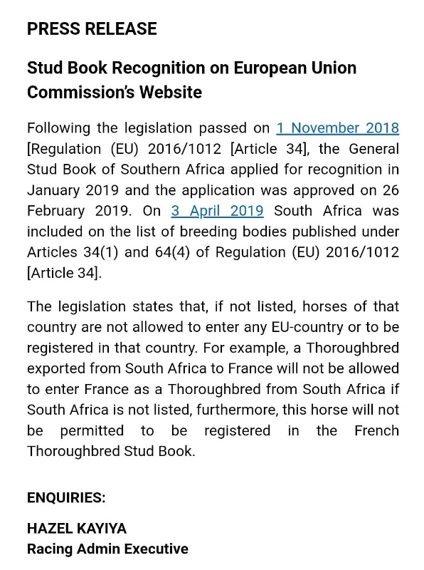 Re: Possible bad news for SAF Bloodstock industry