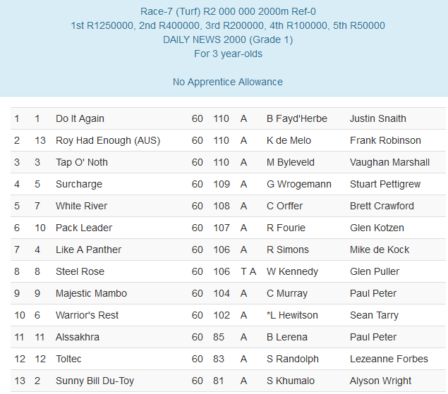 Justin Snaith’s Twice Over gelding Do It Again, second favourite for the Vodacom Durban July on July 7, heads the 13-horse field for the Daily News 2000 with regular pilot Bernard Fayd’Herbe in the irons and the very inside draw from which to jump. While official betting for Saturday’s feature races were not available at the time of writing, the Daisy Guineas winner is likely to start the short-odds favourite.