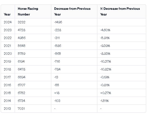 Drop in horses raced in SA. Year on year