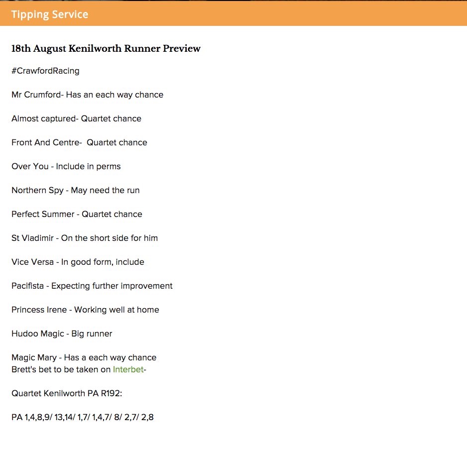 Race 6: Hudoo Magic is the banker for the day. Chrome Yellow is a year older and if not needing it too much after a long break is the danger.
