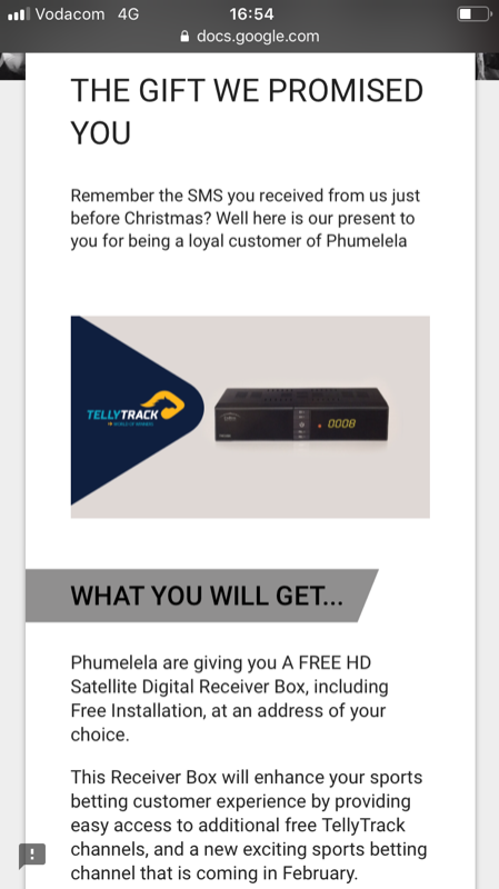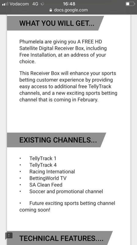 Tellytrack have put 1000 decoders aside for the top 1000 customers of TAB and Betting World. These customers received an sms and if they take up the offer, their decoders will be installed free of charge. So far, about 250 customers have taken up the offer.