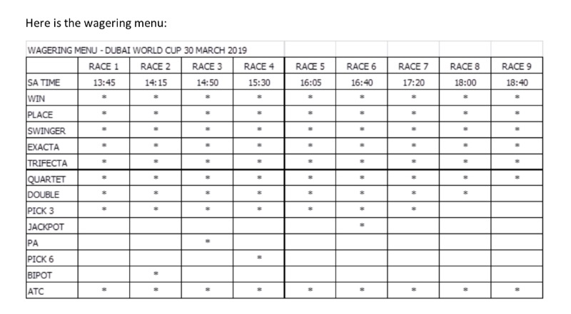 Good news for racegoers is that all nine Dubai World Cup races being run on Saturday will be broadcast live on Tellytrack on channel 239 on DStv.