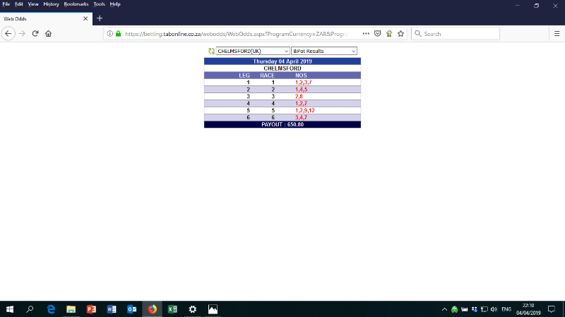 7 years 3 weeks agoEither finger trouble or outright theft... official dividend for Chelmsford BP declared as R650 but only a total of 70.9 winning tickets from a pool of R54520 should pay R769 ??