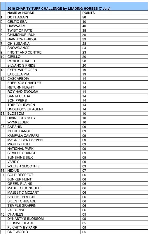 DO IT AGAIN confirmed his status as the best older horse in Africa with a stunning finish to land back to back Vodacom Durban July’s and boost his CTC tally to 50 points. RAINBOW BRIDGE and TWIST OF FATE did little wrong and continued their top class form in KZN. CELTIC SEA showed her brilliance when given a smart ride by HK bound Hewitson, confounding the strong Snaith challenge of OH SUSANNA and SNOWDANCE and in the process capping a top class day for Sean Tarry. The other point scorers on the day were: BASILIUS (1); THE DAZZLER (3); WALTER SMOOTHIE (9); DYNASTY’S BLOSSOM (5); STRATHDON (3); INFAMOUS FOX (2); VAN HALEN (1); PRICELESS RULER (1) and RUNNING BRAVE (1 in Joburg)