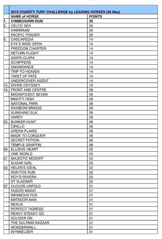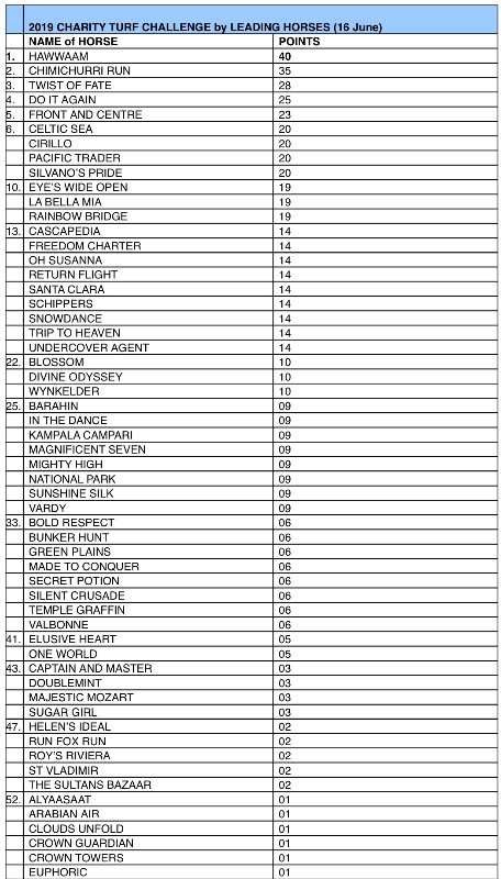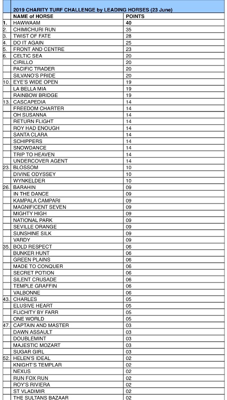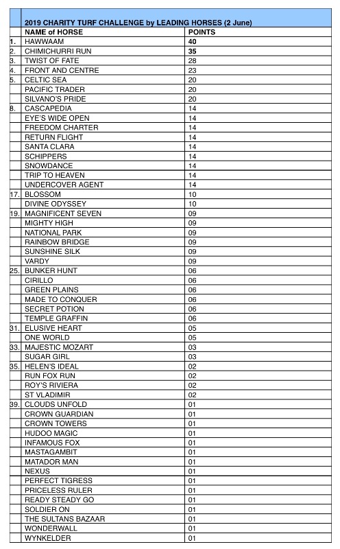 CHIMICHURI RUN lept to the top of the leader board with a stylish victory in the first of the competition bonuses, the Gr.1 Tsogo Sun, and now looks to be the dominant sprinter of his generation. On a day that belonged to the Sean Tarry yard, CELTIC SEA, flew up late to take top honours in the Gr.1 SA Fillies Sprint ahead of the ever consistent SNOWDANCE who advertised her well being for the remainder of the season. And, in Cape Town, VARDY staked his claim for a possible tilt at the Vodacom Durban July when easily accounting for ONE WORLD in the Gr.3 Winter Classic, earning his supporters a valuable 9 points in the process.