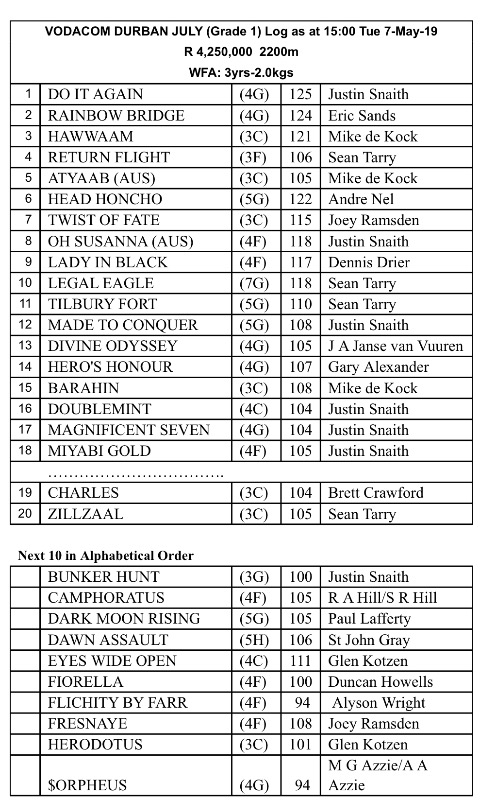 6 years 11 months agoJustin Snaith has six runners included in the initial log for the R4.25 million Gr1 Vodacom Durban July released earlier today. Last year’s winner Do It Again heads the log while stable companion and second last year, Made To Conquer is 15th on the initial list of the 18 preferred entries.