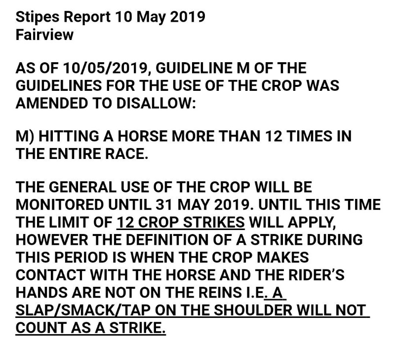 ....these new crops are gentle....but as Bob poses limiting the amount of smacks is going to encourage some riders to go back to the real sharp thin sticks that really do hurt.....and yes it is not how you strike a horse but where.....saw that Peruvian cowboy chopping a mount in the gut....some others flaying away and smacking challenging mounts in the face....we should be more concerned how it is wielded and not as yet be discouraging its use totally.....certain horses need a reminder others not.....if jocks have not worked it out yet they should start paying the NHRA kitty to contribute to travel more often to the bush and try see that geriatric horses are not thrashed there either.....:S