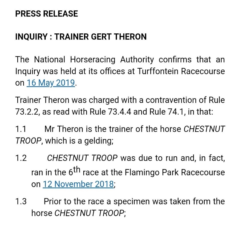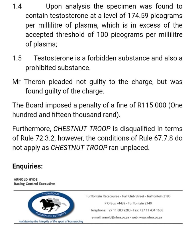 .....and if a day later they would have no case.....for those who are not aware testosterone is a metabolite of steroid use....it may occur naturally in colts and androgynous female specimens..... our authorities allowed the use of steriods in training for many many years and only recently banned them totally.....but there will still be those that attempt to use them, especially in areas where it is difficult to test for in training usage...:dry: