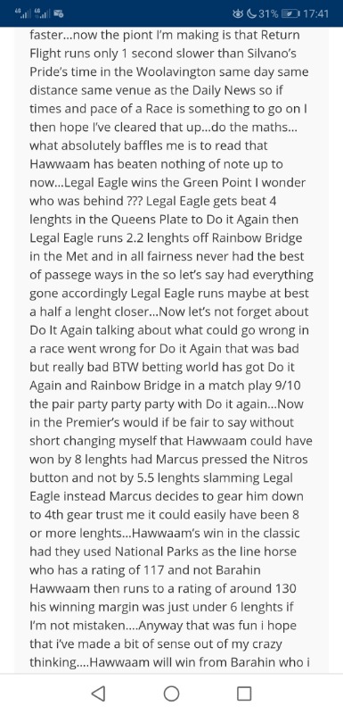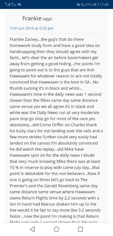 the guy’s that do their homework study form and have a good idea on handicapping then they should agree with my facts…let’s clear the air before bookmakers get away from getting a good hiding…the points I’m going to point out is to the guys that are Anti Hawwaam for whatever reason or are not totally convinced that Hawwaam is the best in SA…No thumb sucking it’s in black and white… Hawwaam’s time in the daily news was 1 second slower than the fillies same day same distance same venue yes we all agree it’s in black and white was the Daily News run at very moderate pace stop go stop go for most of the race yes absolutely…did Corne Orffer on Charles thank his lucky stars for not landing over the rails and a few more strides further could very easily had landed on the canvas I’m absolutely convinced he did watch the replay…did Mike have Hawwaam spot on for the daily news I doubt that very much knowing Mike there was at least 15 % in reserve to play with come July day…that point is debatable for the non-believers…Now if one is going on times let’s go back to The Premier’s and the Gerald Rosenberg same day same distance same venue where Hawwaam slams Return Flights time by 2,2 seconds with a ton in hand had Marcus shaken him up to the line would it be fair to say more like 3.2 seconds faster…now the point I’m making is that Return Flight runs only 1 second slower than Silvano’s Pride’s time in the Woolavington same day same distance same venue as the Daily News so if times and pace of a Race is something to go on I then hope I’ve cleared that up…do the maths…what absolutely baffles me is to read that Hawwaam has beaten nothing of note up to now…Legal Eagle wins the Green Point I wonder who was behind ??? Legal Eagle gets beat 4 lengths in the Queens Plate to Do it Again then Legal Eagle runs 2.2 lengths off Rainbow Bridge in the Met and in all fairness never had the best of passage ways in the so let’s say had everything gone accordingly Legal Eagle runs maybe at best a half a length closer…Now let’s not forget about Do It Again talking about what could go wrong in a race went wrong for Do it Again that was bad but really bad BTW betting world has got Do it Again and Rainbow Bridge in a match play 9/10 the pair party party party with Do it again…Now in the Premier’s would it be fair to say without short changing myself that Hawwaam could have won by 8 lengths had Marcus pressed the Nitros button and not by 5.5 lengths slamming Legal Eagle instead Marcus decides to gear him down to 4th gear trust me it could easily have been 8 or more lengths…Hawwaam’s win in the classic had they used National Parks as the line horse who has a rating of 117 and not Barahin Hawwaam then runs to a rating of around 130 his winning margin was just under 6 lengths if I’m not mistaken….Anyway that was fun I hope that I’ve made a bit of sense out of my crazy thinking….Hawwaam will win from Barahin who I personally think is much better than a 112 rating that’s just my personal opinion I say his true ability rating is around 120…