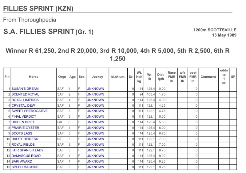 A reliable poster has informed me that Scented Royal contested the Grade 1 SA Fillies Sprint in 1989 as a 2yo and finished second.