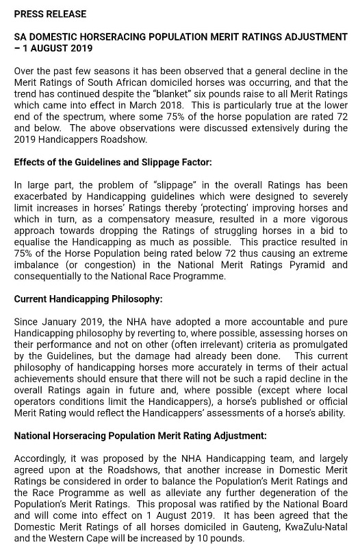 It has been agreed that the Domestic Merit Ratings of all horses domiciled in Gauteng, KwaZulu Natal and Western Cape