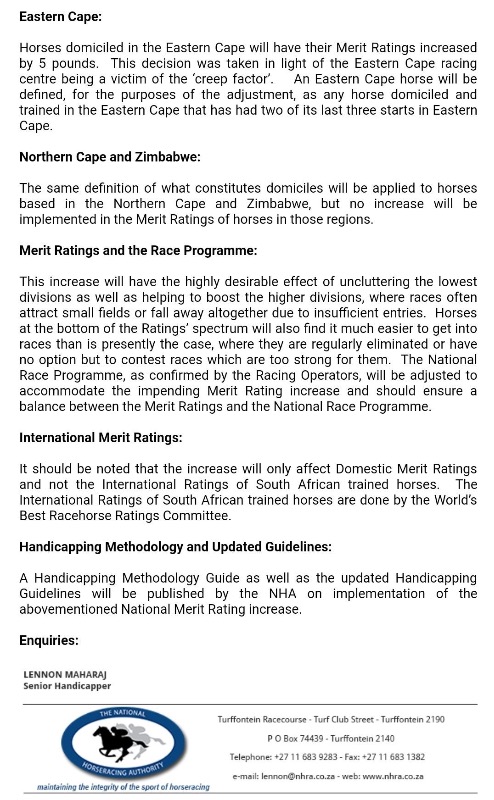 The same definition of what constitutes domiciles will be applied to horses based in the Northern Cape and Zimbabwe, but no increase will be implemented in the Merit Ratings of horses in those regions.