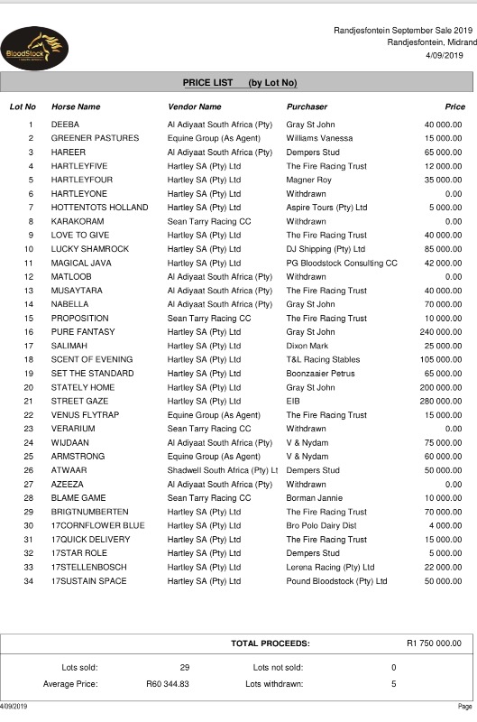 On behalf of Hartley SA (Pty) Ltd, I would like to place on record our appreciation to the vendors for the care they have given our horses. To the buyers out there, thank you for your support in advance and may your investments bear fruit!