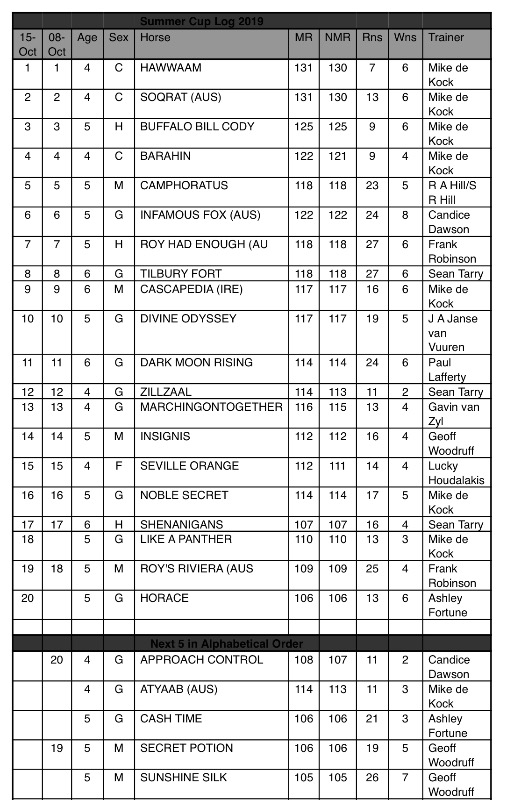 While the latest Gauteng Summer Cup Log is unchanged, there are four Merit Rating changes highlighted in grey.
