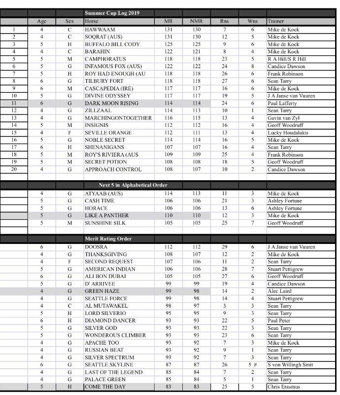 • Dark Moon Rising drops from 115 to 114 after his comeback run when leading in a slowly run race at Greyville.