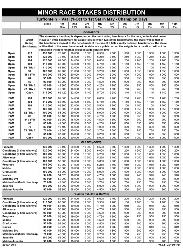 * Introducing different minor-race stakes levels in and out of season on the Highveld and in the Western Cape (the Highveld feature season runs from 1 October to the first Saturday in May, whilst the Western Cape feature season runs from 1 November to the end of February)