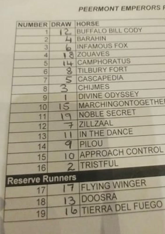 Final field with draws for the R1-million Peermont Emperors Palace Charity Mile (Grade 2) over 1600m on the Turffontein Standside track on Saturday 2 November.