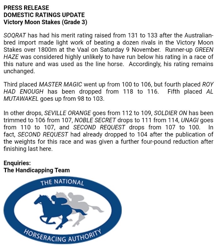 If Green haze ran to his 107 rating then Soqrat ran to a 133 actually.....and if that is the case then Master Magic will be penalised 6 points and Al Mutawakel 5 points . RHE then ran 3 points less than his rating and Divine Odessey 2 points less.