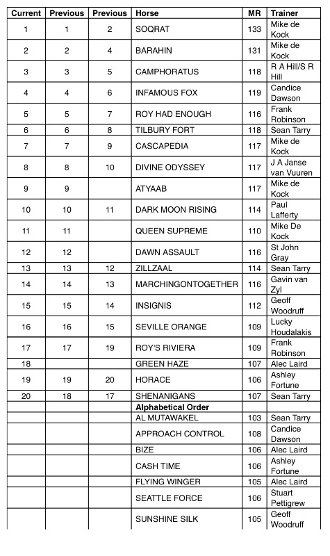 Soqrat tops the log but trainer Mike de Kock has said the Australian-red four-year-old would be aimed at the L’Ormarins Queen’s Plate and the Sun Met, and that he will not run in the Summer Cup.