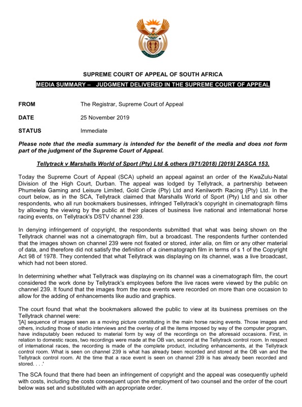 Tellytrack v Marshalls World of Sport (Pty) Ltd & others (971/2018) [2019] ZASCA 153.