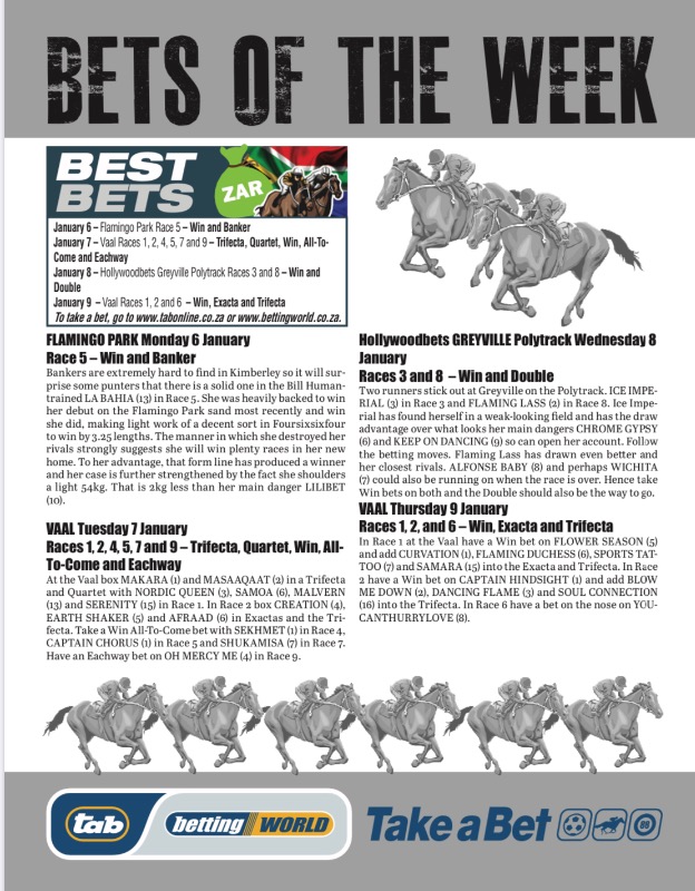 Please pass on our apologies to MissT with regards to the Bets of the Week page. Please find attach the correct version that should have gone to print.