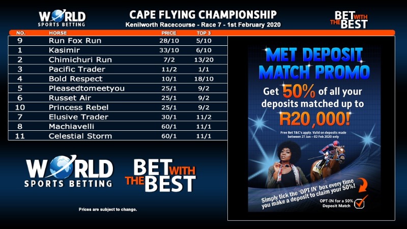 R7) Whilst Run Fox Run has been backed into favourite, just think the fillies have it all to do at the weights. My pick as mentioned on another thread is Kasimir. Here's how I see the race unfolding. They know they cannot let Run Fox Run get too far ahead, as she might be difficult to reel in. I expect Pacific Trader to hang on to her coat-tail and pull the rest along. I don't believe Run Fox Run is well in here, and for that reason, Kasimir, who is well in here, will be running at them late in the piece. Fancy the exacta 1 X 2. As an aside, Snaith was quoted as saying, "If I had to pick a horse for the day, I think Kasimir is a huge runner in the Cape Flying Championship". I am not rowing in with Kasimir because the trainer fancy's his charge, always thought it was the right one in the race.