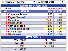 Redcliffe midday race - We normally have good local exotic pools on these with proper build up - Like R8000 each swinger quartet trifecta. Tellytrack chose to show adverts for the many mins leading up to the race, with no indication that the race was coming up, and only cut to the race with 30seconds to go to bet before the were off. They has easily a clear 8-10 mins to actually build up these pools with no other races to distract, but instead showed adverts for dream numbers.